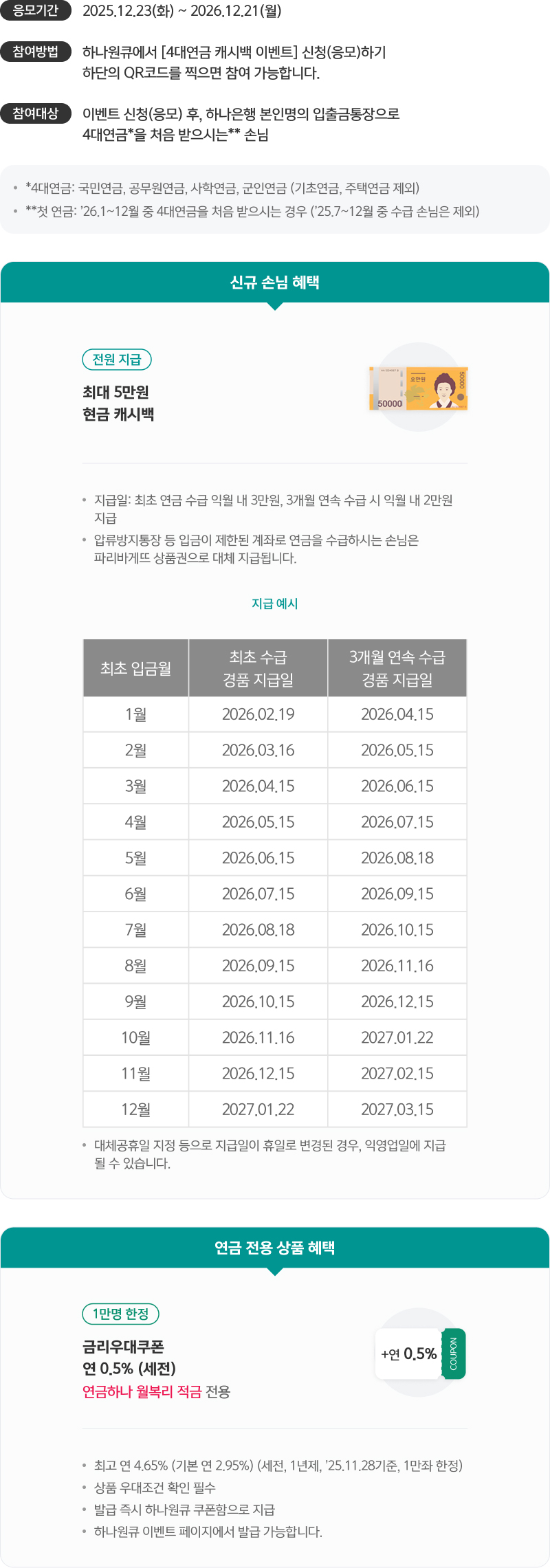 현금 캐시백은 ’25.7~12월 기간 중 4대연금을 하나은행으로 받으셨던 손님은 제외되며, ‘26.1~12월 하나은행으로 4대연금을 처음 받으신 경우, 최초 연금 수급계좌로