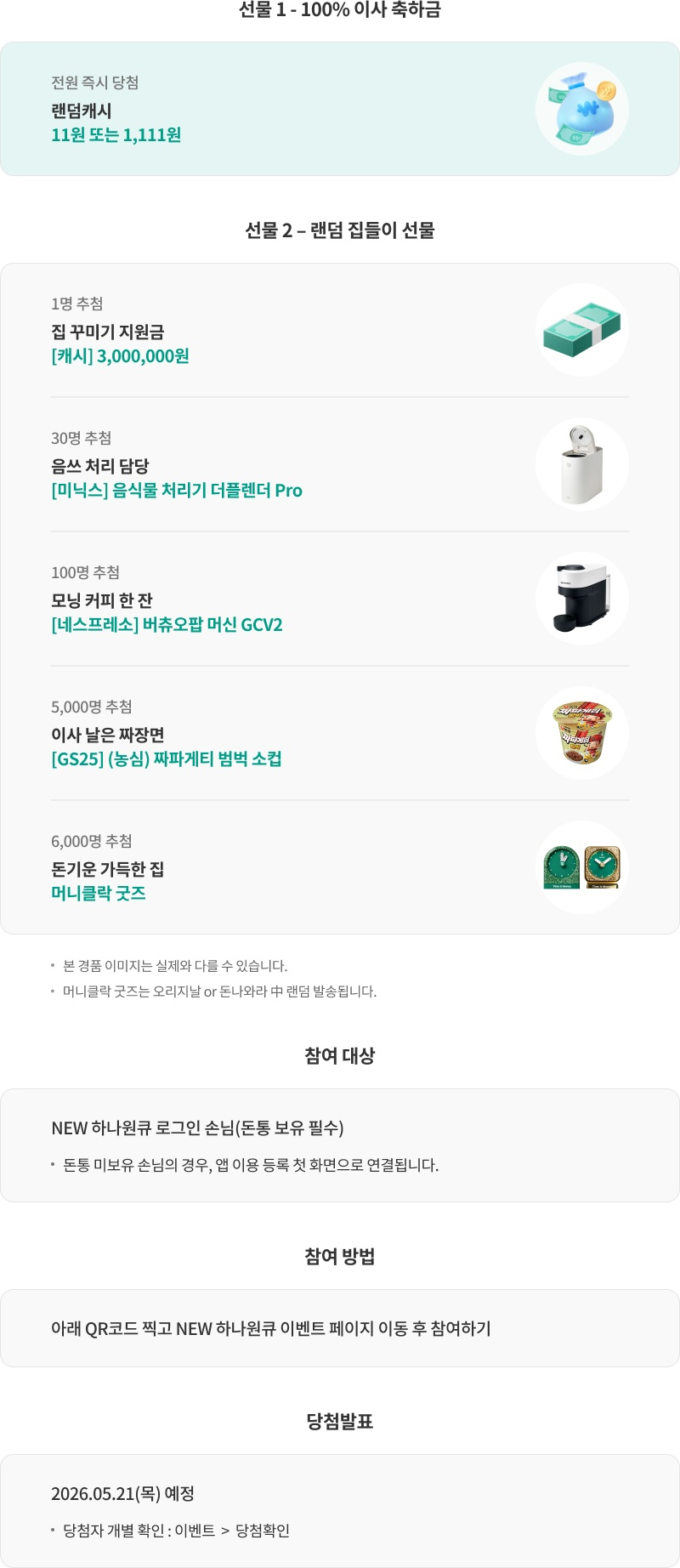 - 이벤트 실물 경품은 2026년 6월 이내 하나은행에서 등록하신 자택주소로 발송 예정입니다.