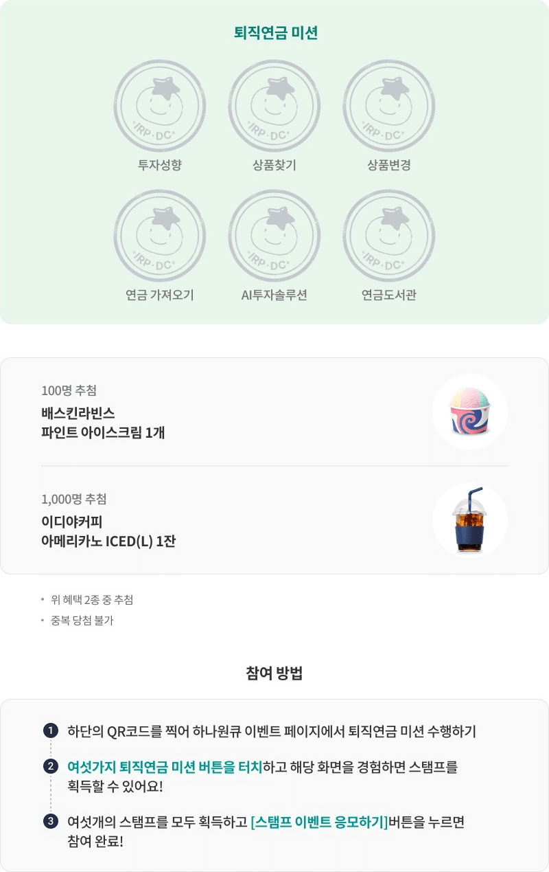- 퇴직연금 특별이익은 감독규정에 의거 연간 누적 3만원 한도 내 제공됩니다. 본 이벤트 포함 퇴직연금 특별이익 제공한도 초과한 손님은 혜택 제공이 불가할 수 있습니다.